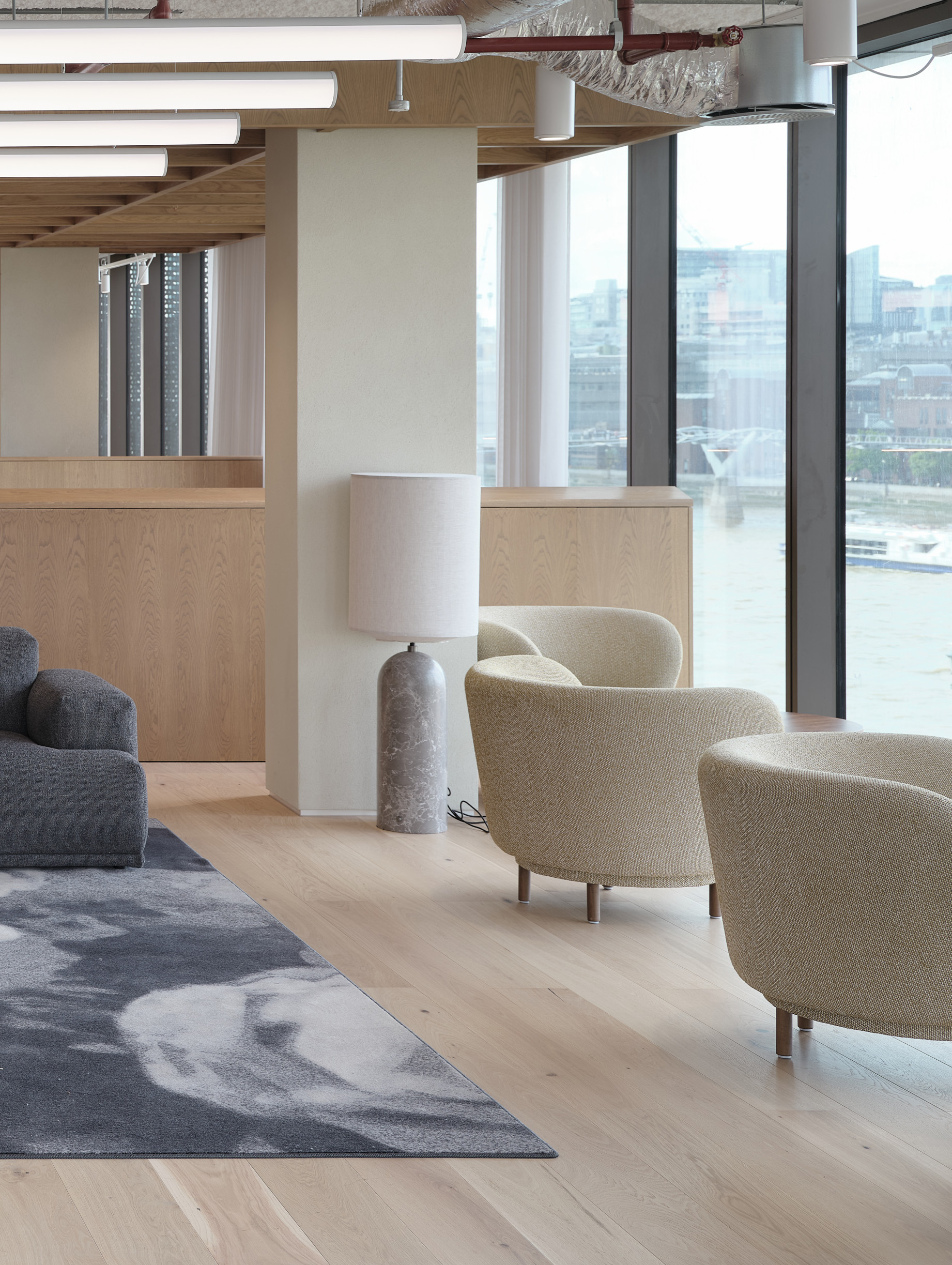 Designed to be a catalyst for connection and creativity, One Southwark Bridge stands as a powerful symbol of WPP’s commitment to the UK, prioritising employee wellbeing and reinforcing the company’s commitment to sustainability. All materials were sourced with a tracked carbon journey, together with conscious decisions to specify finishes containing recycled content.
