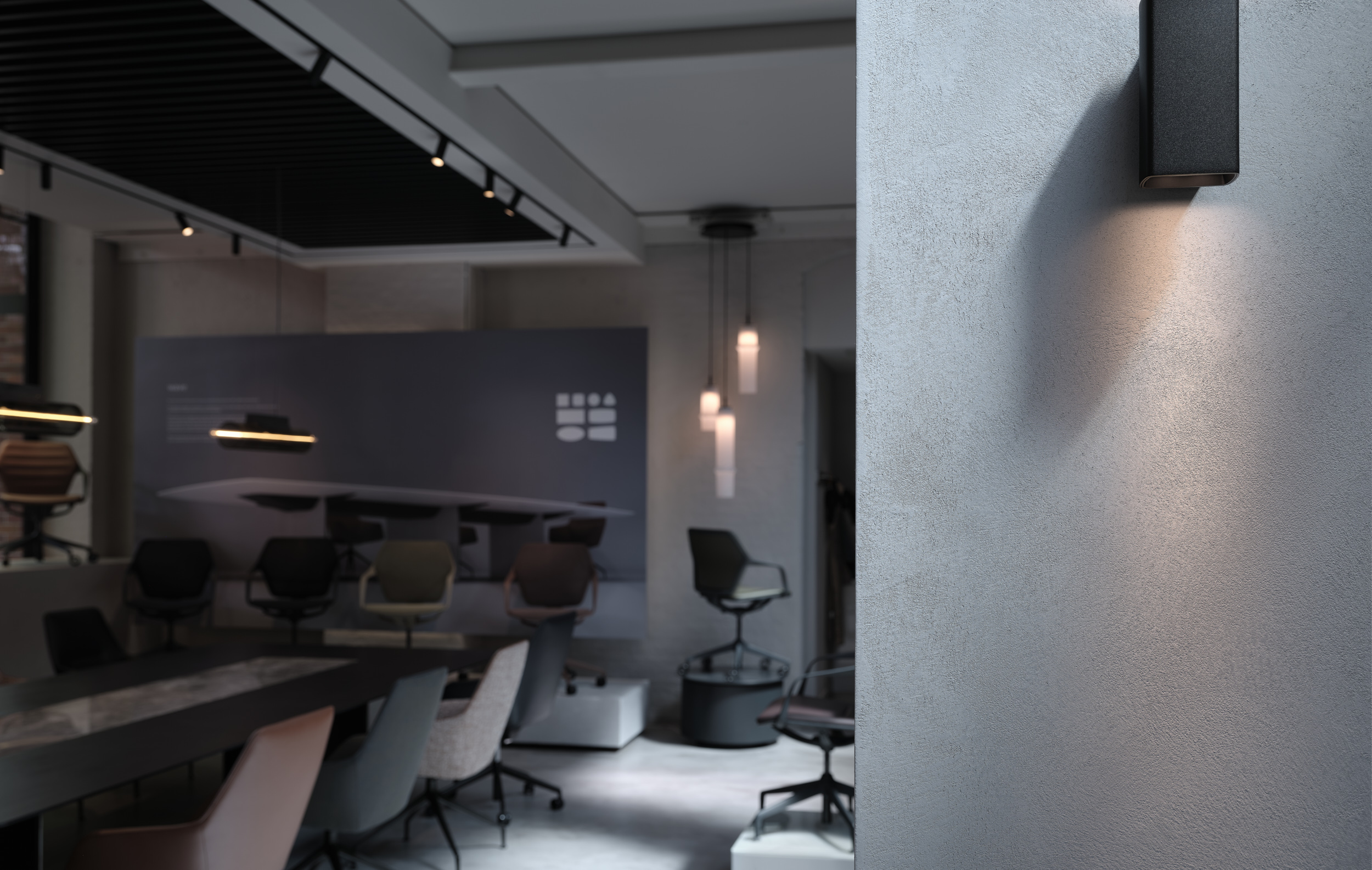 Polished Plaster Koncrete Honed applied to the reception desk and walls of the refurbished 210 building, Wokingham.