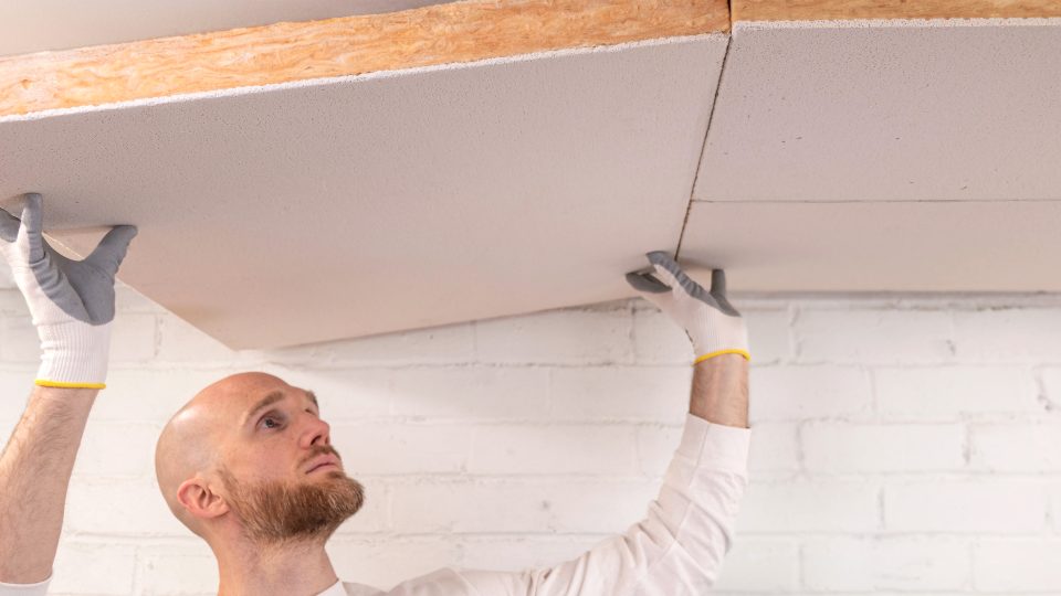 Pre-coated acoustic panels are installed alongside any required details for services.